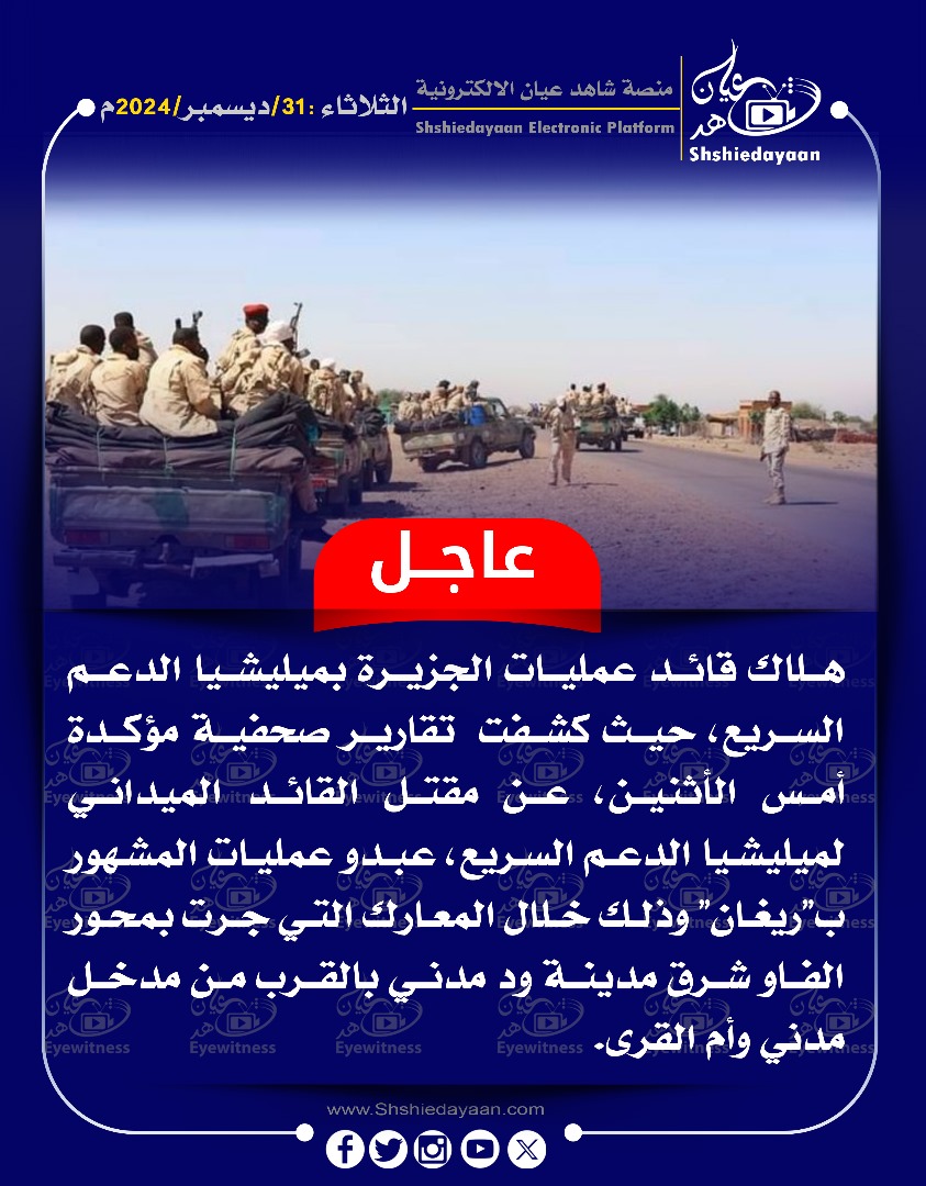 خبر في صورة الأخبار بعد ظهور المليشي عصام فضيل في حالة إعياء وبتر في يده، شاهد عيان ديسمبر 31, 2024 0 أقرأ المزيد ..