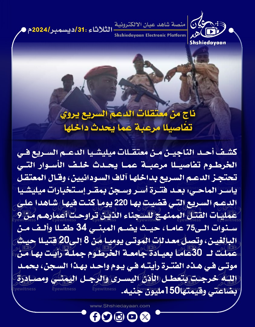 خبر في صورة الأخبار ناج من معتقلات الدعم السريع يروي تفاصيلا مرعبة عما يحدث داخلها شاهد عيان ديسمبر 31, 2024 0 أقرأ المزيد ..