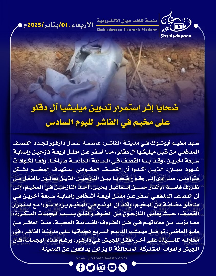 خبر في صورة ضحايا إثر استمرار تدوين ميليشيا آل دقلو على مخيم في الفاشر لليوم السادس شاهد عيان يناير 1, 2025 0 أقرأ المزيد ..