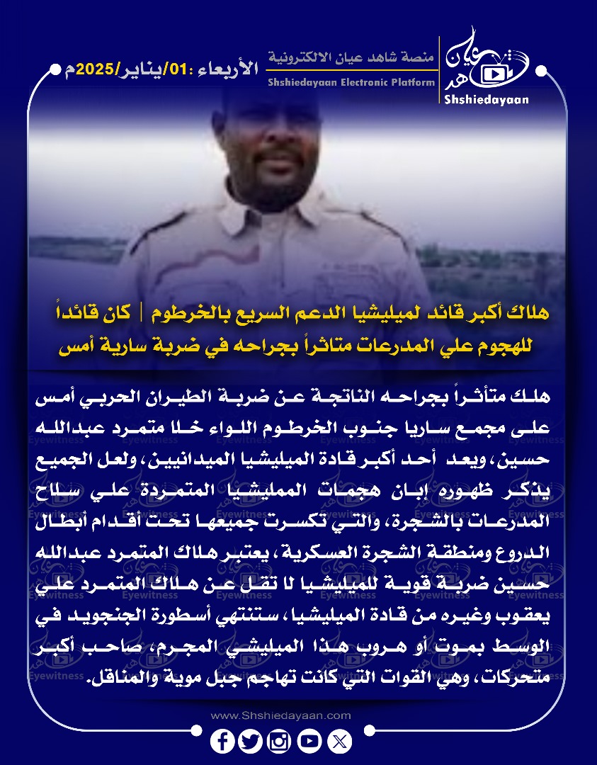 خبر في صورة هلاك أكبر قائد لميليشيا الدعم السريع بالخرطوم | كان قائداً للهجوم علي المدرعات متاثراً بجراحه في ضربة سارية أمس شاهد عيان يناير 1, 2025 0 أقرأ المزيد ..