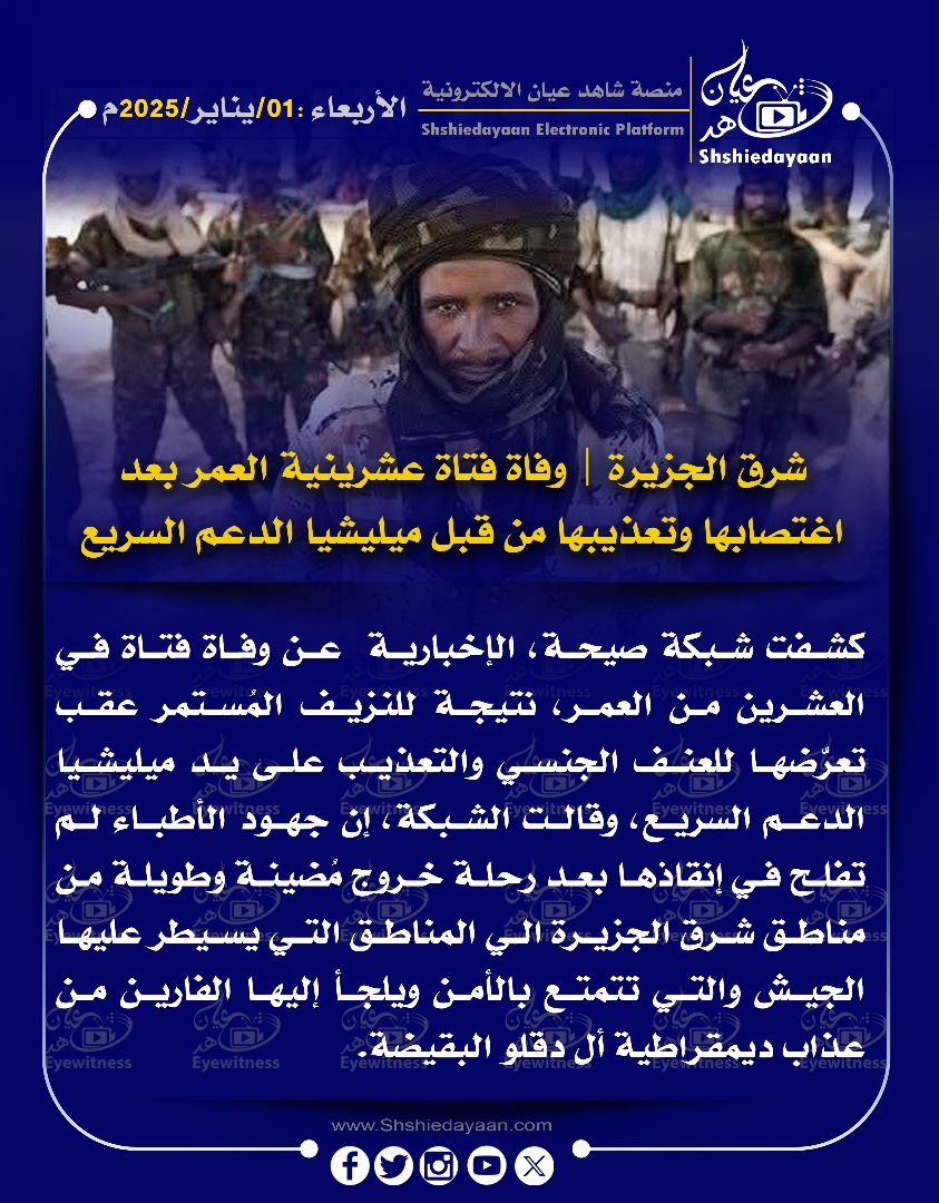 خبر في صورة شرق الجزيرة | وفاة فتاة عشرينية العمر بعد اغتصابها وتعذيبها من قبل ميليشيا الدعم السريع شاهد عيان يناير 1, 2025 0 أقرأ المزيد ..