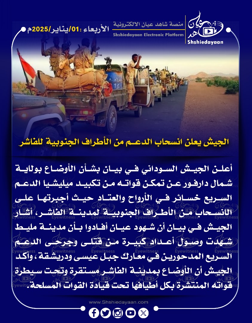 خبر في صورة الجيش يعلن انسحاب الدعم من الأطراف الجنوبية للفاشر شاهد عيان يناير 1, 2025 0 أقرأ المزيد ..