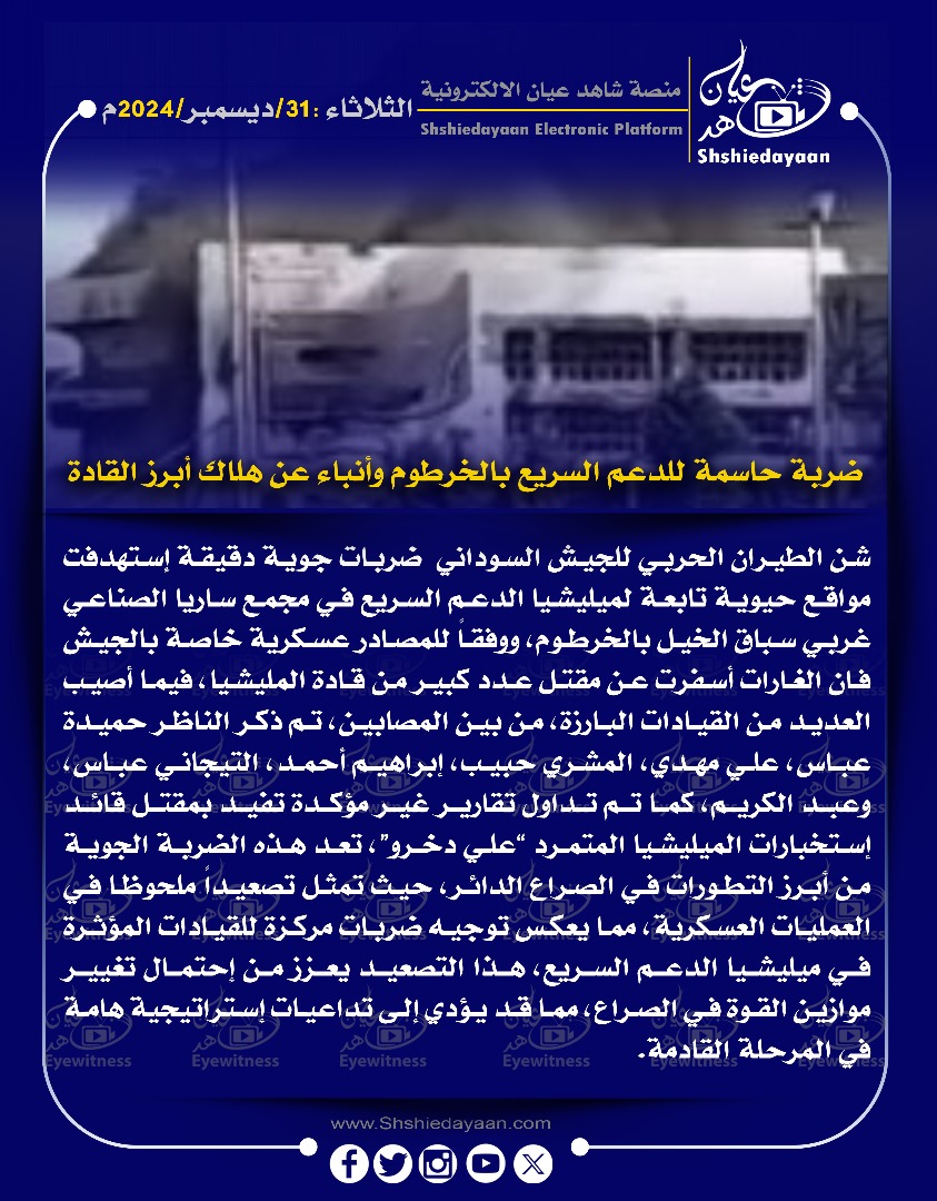 خبر في صورة ضربة حاسمة للدعم السريع بالخرطوم وأنباء عن هلاك أبرز القادة شاهد عيان ديسمبر 31, 2024 0 أقرأ المزيد ..