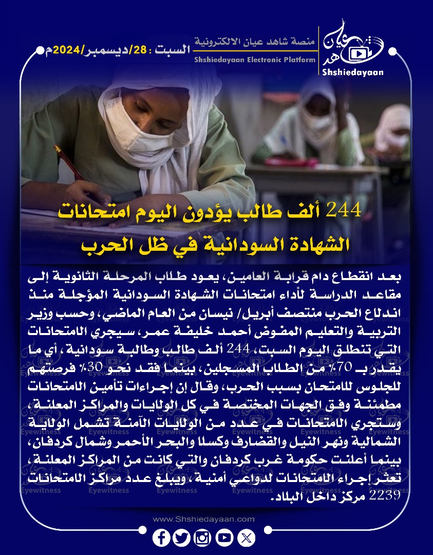 خبر في صورة 211 ألف طالب يؤدون اليوم امتحانات الشهادة السودانية في ظل الحرب شاهد عيان ديسمبر 28, 2024 0 أقرأ المزيد ..