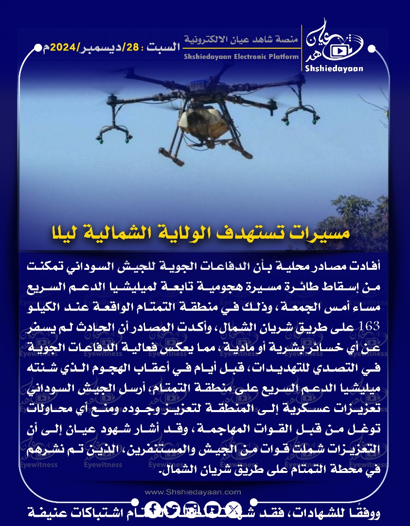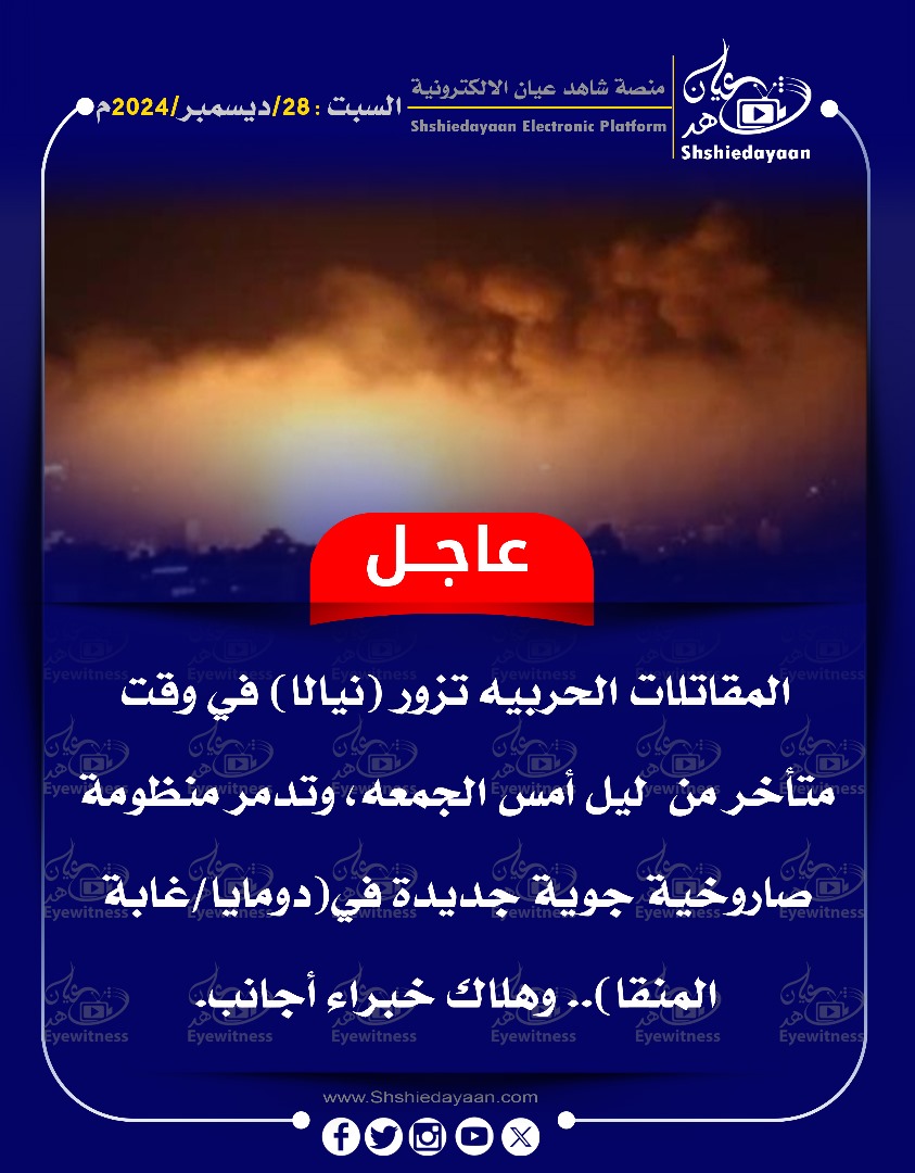 خبر في صورة عاجل … المقاتلات الحربية تزور ( نيالا) في وقت متأخر من ليل أمس الجمعه، وتدمر منظومة صاروخية جوية جديدة شاهد عيان ديسمبر 28, 2024 0 أقرأ المزيد ..