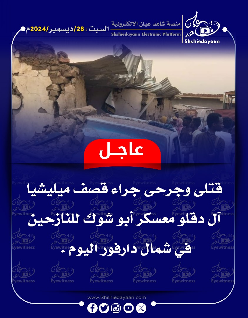 خبر في صورة عاجل …. ميليشيا آل دقلو قصف مركزا لإيواء النازحين بمنطقة شالا بالمحيط الغربي لمدينة الفاشر شاهد عيان ديسمبر 28, 2024 0 أقرأ المزيد ..