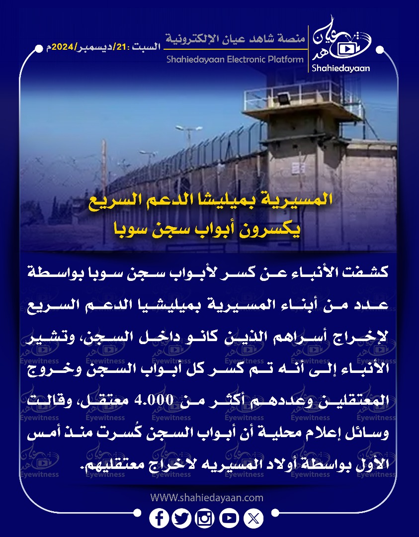 الأخبار خبر في صورة المسيرية بميليشا الدعم السريع يكسرون أبواب سجن سوبا شاهد عيان ديسمبر 21, 2024 0 أقرأ المزيد ..