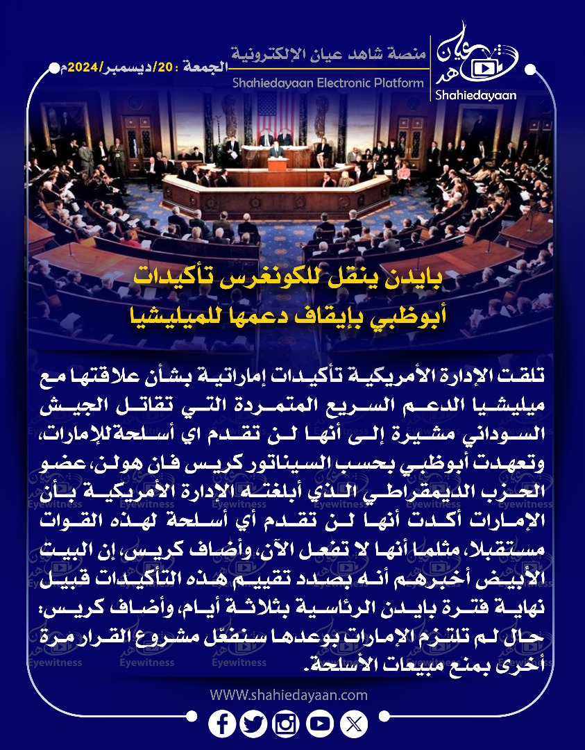 خبر في صورة بايدن ينقل للكونغرس تأكيدات أبوظبي بإيقاف دعمها للميليشيا شاهد عيان ديسمبر 20, 2024 0 أقرأ المزيد ..
