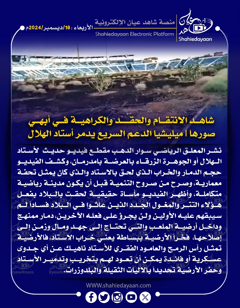 خبر في صورة شاهد الانتقام والحقد والكراهية في أيهي صورها ميليشيا الدعم السريع يدمر أستاد الهلال نشر المعلق الرياضي سوار الذهب مقطع فيديو حديث الاستاد شاهد عيان ديسمبر 18, 2024 0 أقرأ المزيد ..