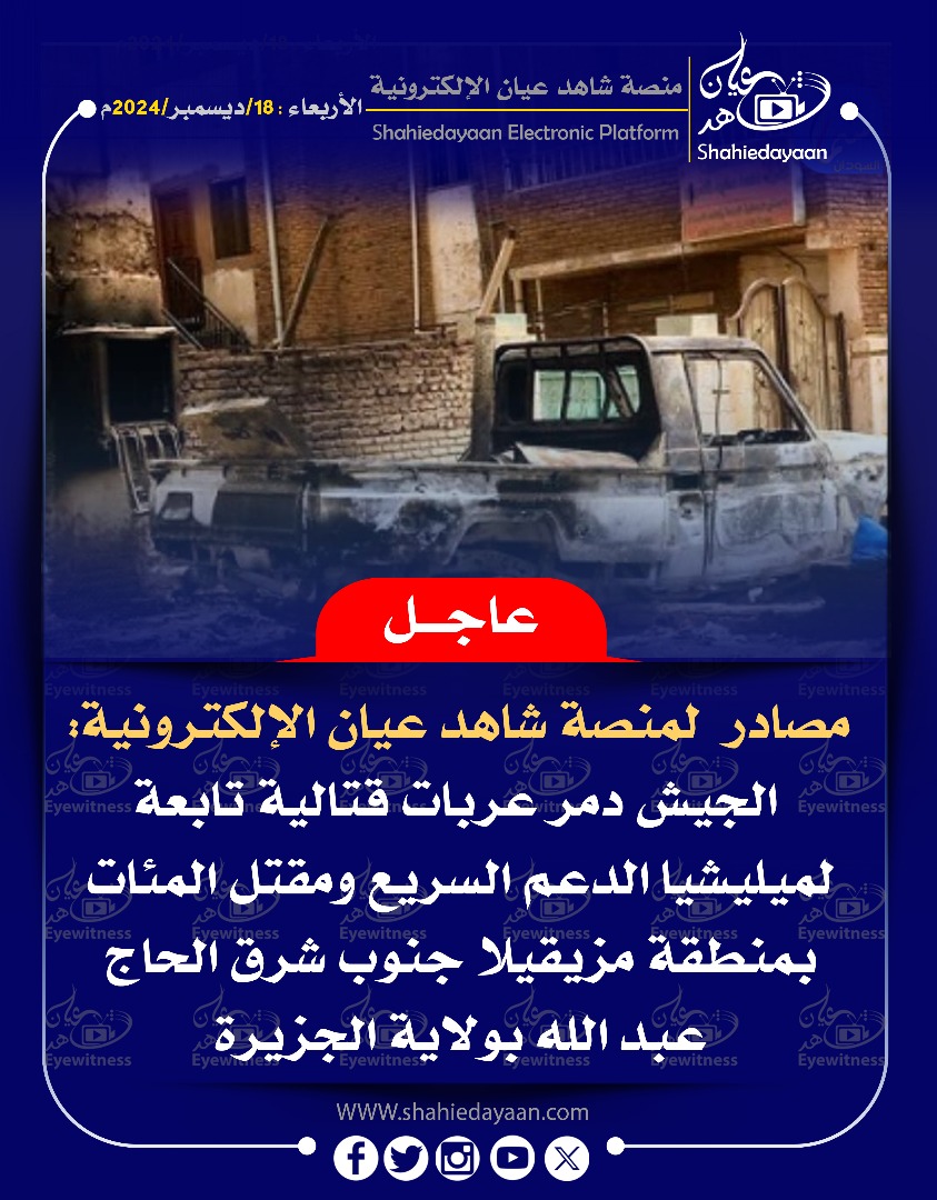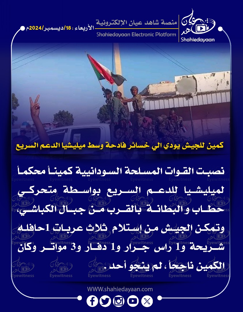 خبر في صورة كمين للجيش يودي الي خسائر فادحة وسط ميليشيا الدعم السريع شاهد عيان ديسمبر 18, 2024 0 أقرأ المزيد ..