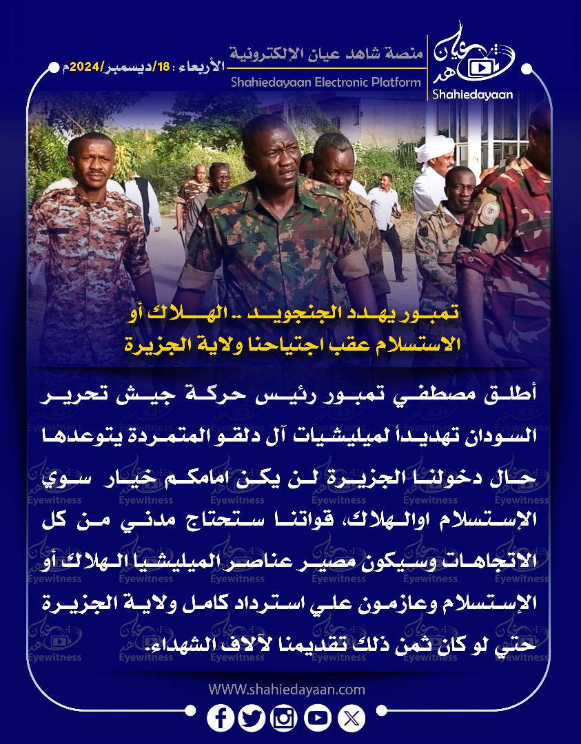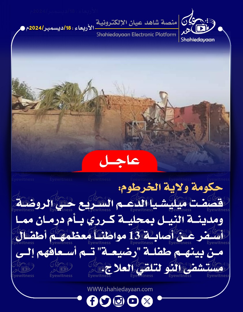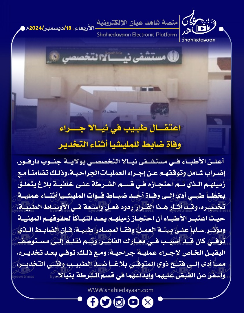 خبر في صورة اعتقال طبيب في نيالا جراء وفاة ضابط للمليشيا أثناء التخدير شاهد عيان ديسمبر 18, 2024 0 أقرأ المزيد ..