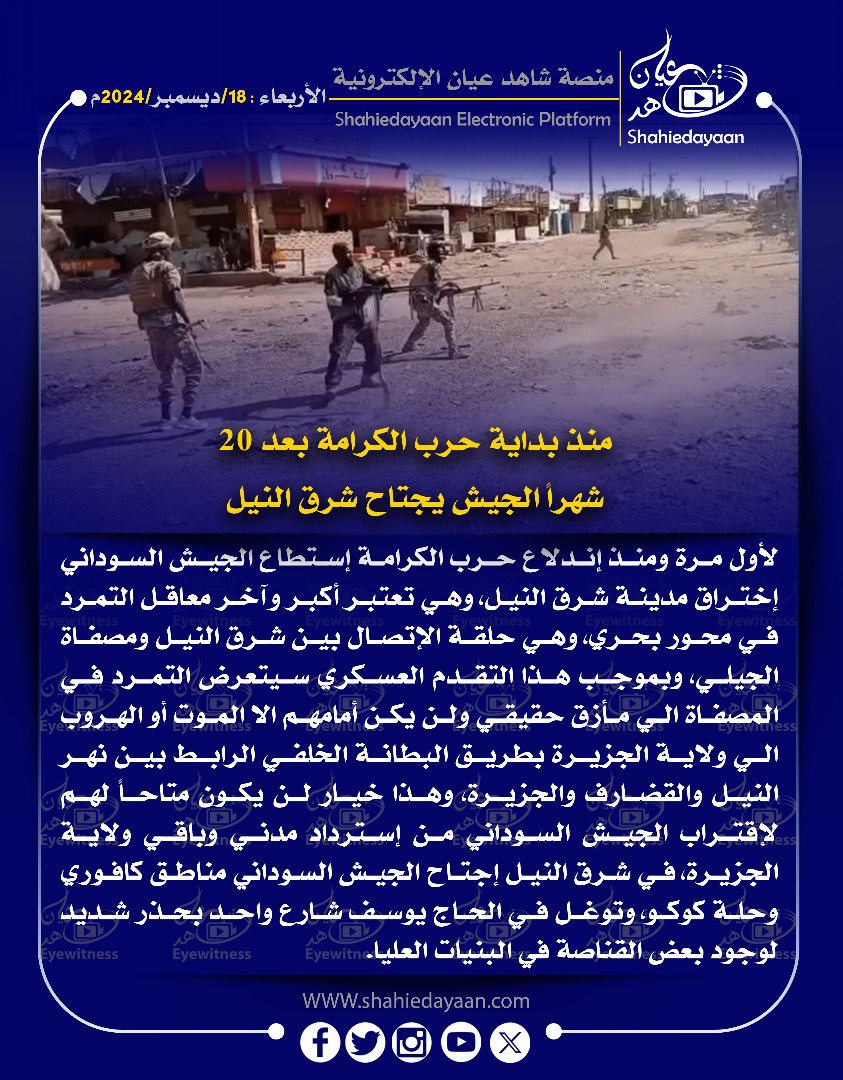 خبر في صورة منذ بداية حرب الكرامة بعد 20 شهرا الجيش يجتاح شرق النيل شاهد عيان ديسمبر 18, 2024 0 أقرأ المزيد ..