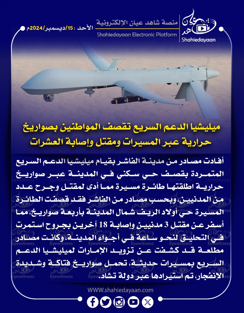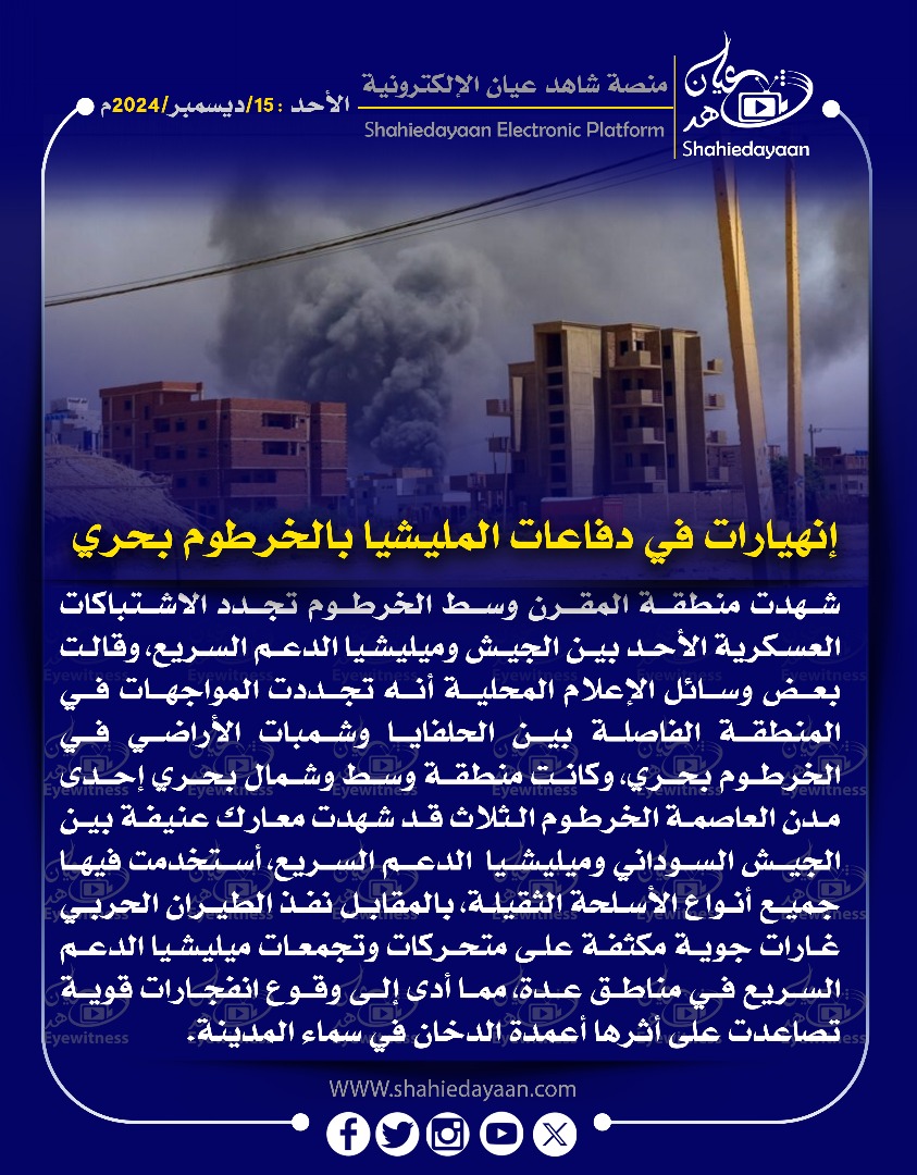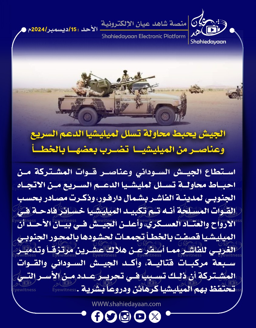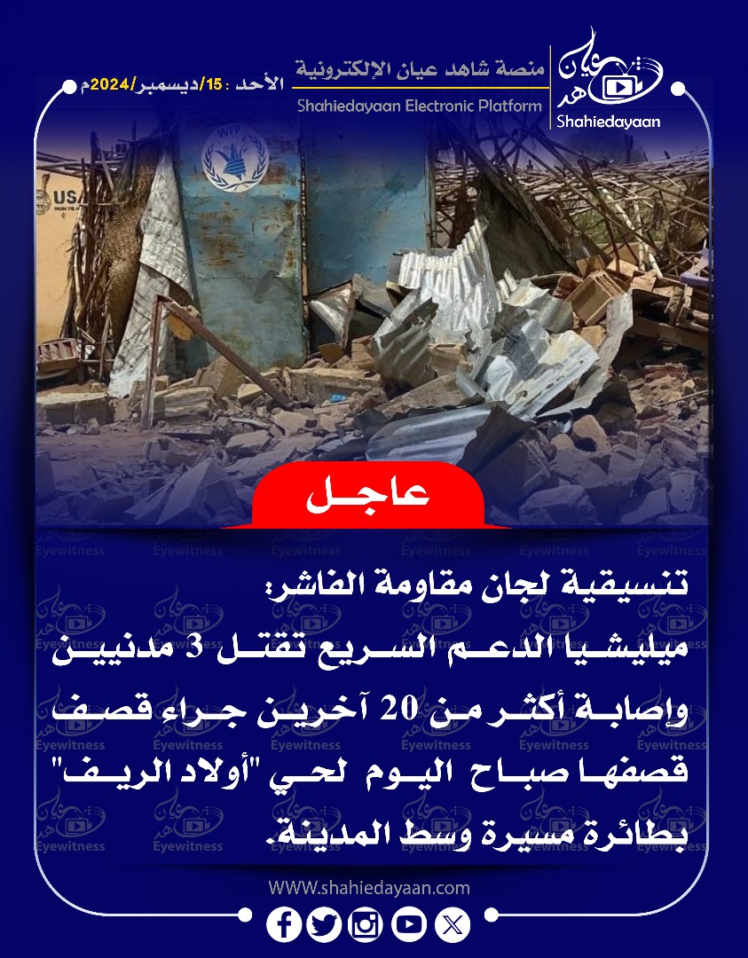 خبر في صورة تنسيقية لجان مقاومة الفاشر بيان ميليشيا الدعم السريع تقتل 3 مدنيين وإصابة أكثر من 20 آخرين شاهد عيان ديسمبر 15, 2024 0 أقرأ المزيد ..