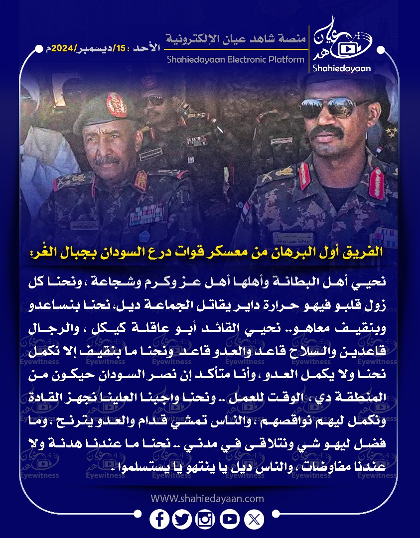 خبر في صورة الفريق أول البرهان من معسكر قوات درع السودان بجبال الغر: شاهد عيان ديسمبر 15, 2024 0 أقرأ المزيد ..