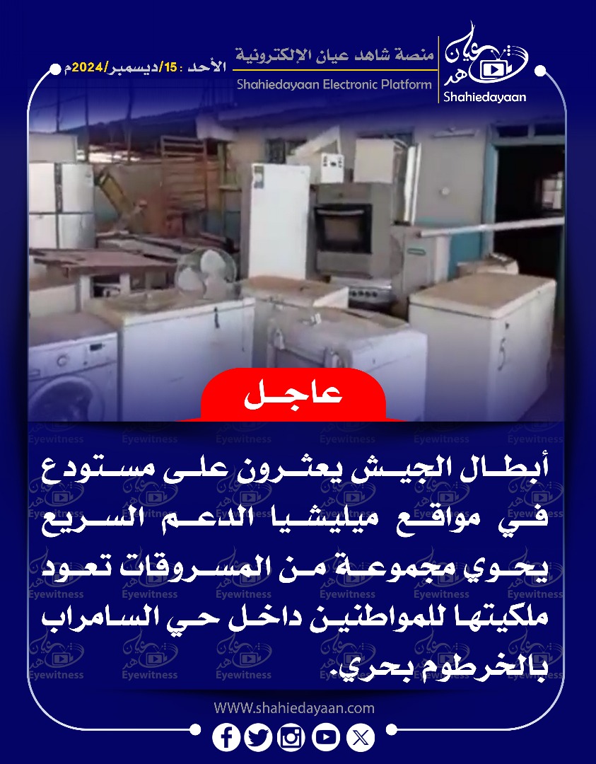 خبر في صورة أبطال الجيش يعثرون على مستودع في مواقع ميليشيا الدعم السريع يحوي مجموعة من المسروقات شاهد عيان ديسمبر 15, 2024 0 أقرأ المزيد ..