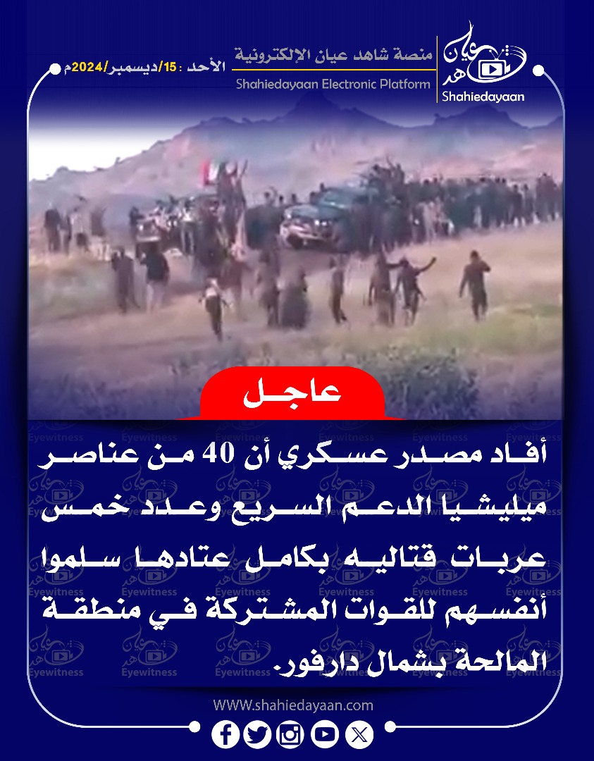 خبر في صورة أفاد مصدر عسكري أن 40 من عناصر ميليشيا الدعم السريع وعدد خمس عربات قتاليه بكامل عتادها سلموا شاهد عيان ديسمبر 15, 2024 0 أقرأ المزيد ..