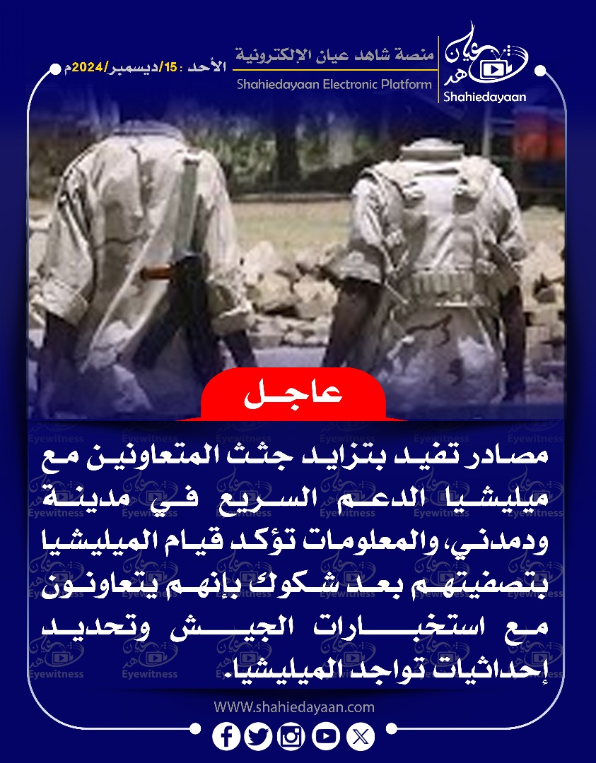 خبر في صورة مصادر تفيد بتزايد جثث المتعاونين مع ميليشيا الدعم السريع في مدينة ودمدني شاهد عيان ديسمبر 15, 2024 0 أقرأ المزيد ..