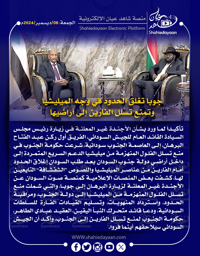 خبر في صورة جوبا تغلق الحدود في وجه الميليشيا . وتمنع تسلل الفارين إلى أراضيها شاهد عيان ديسمبر 6, 2024 0 أقرأ المزيد ..