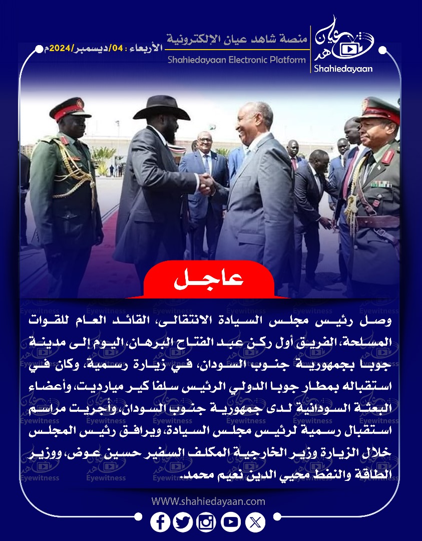 خبر في صورة وصل رئيس مجلس السيادة الانتقالي القائد العام للقوات المسلحة الفريق أول ركن عبد الفتاح البرهان اليوم إلى مدينة جوبا بجمهورية جنوب السودان شاهد عيان ديسمبر 4, 2024 0 أقرأ المزيد ..
