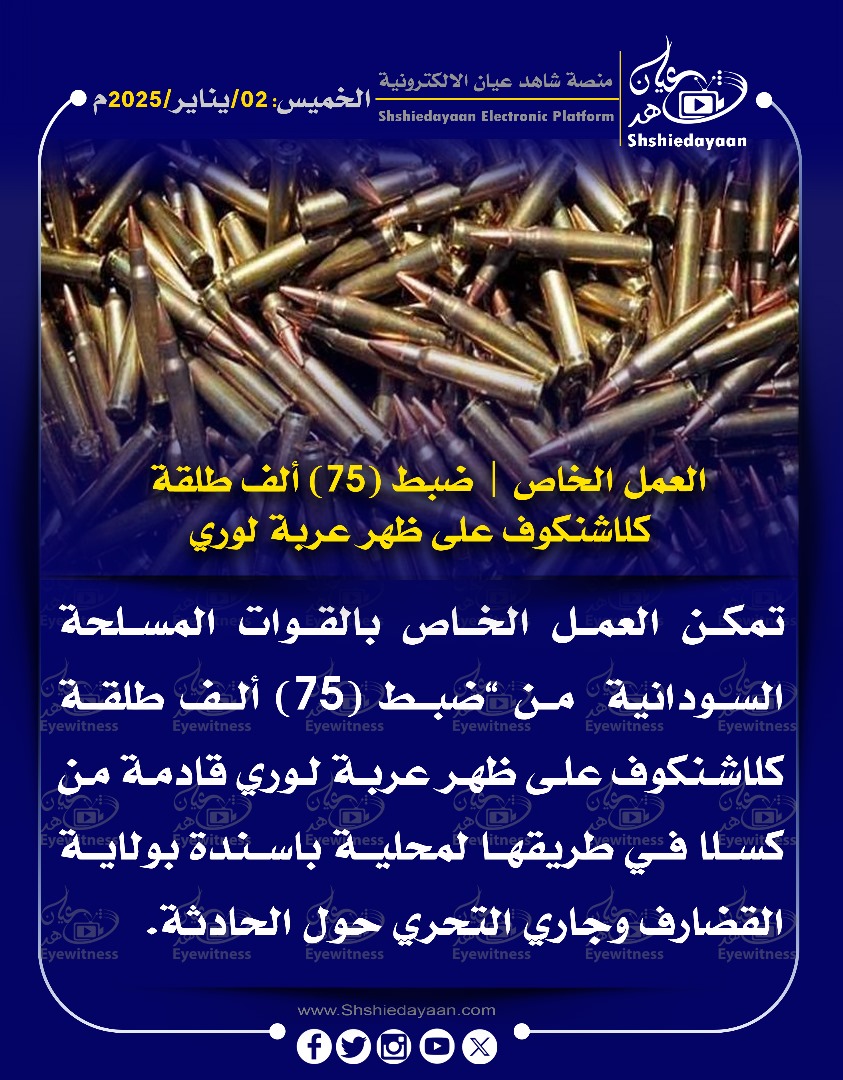 شهادة الوهمين العمل الخاص | ضبط (75) ألف طلقة كلاشنكوف على ظهر عربة لوري شاهد عيان يناير 2, 2025 0 أقرأ المزيد ..