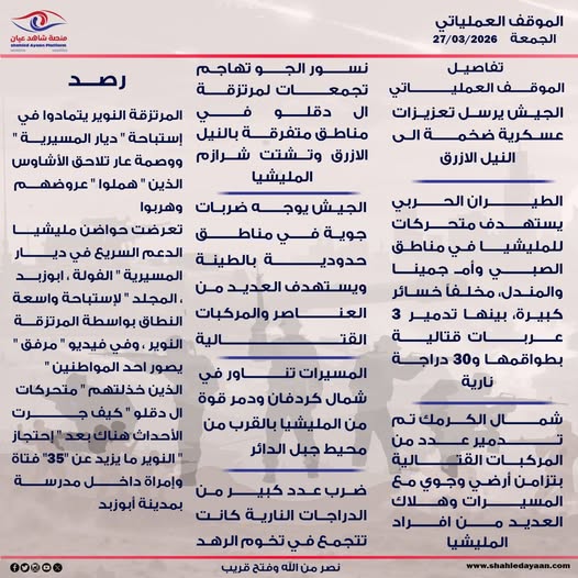 – الجيش يرسل تعزيزات عسكرية ضخمة الى النيل الازرق. – الطيران الحربي يستهدف متحركات للمليشيا في مناطق الصبي وأم جمينا…