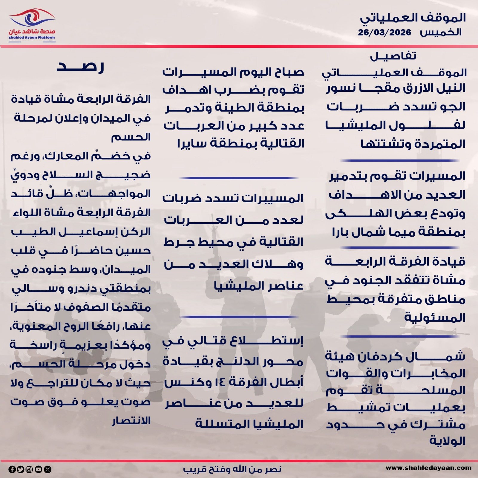 شاهد عيان | الموقف العملياتي – الخميس 26 مارس 2026م – النيل الازرق مقجا نسور الجو تسدد ضربات لفلول المليشيا…