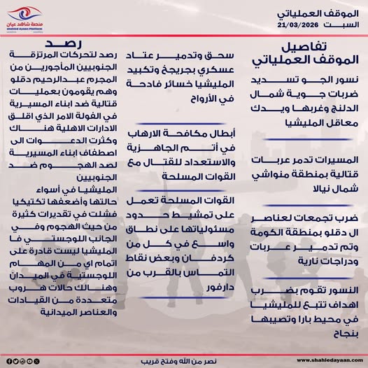 – نسور الجو تسديد ضربات جوية شمال الدلنج وغربها ويدك معاقل المليشيا. – المسيرات تدمر عربات قتالية بمنطقة منواشي شمال…
