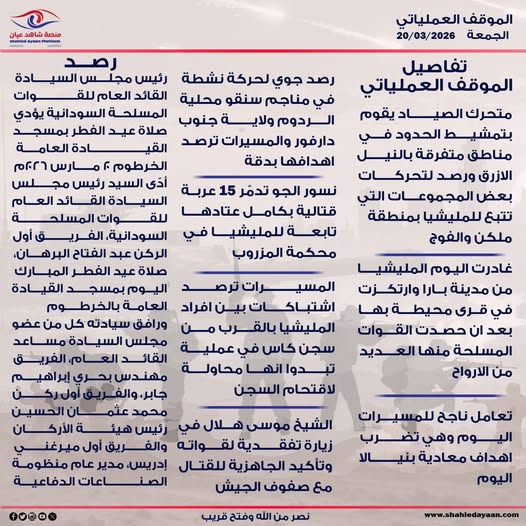 أفادت مصادر ميدانية لـ “منصة شاهد عيان” بأن الطيران الحربي والمسيرات التابعة للجيش السوداني نفذت ضربات جوية دقيقة استهدفت مواقع…