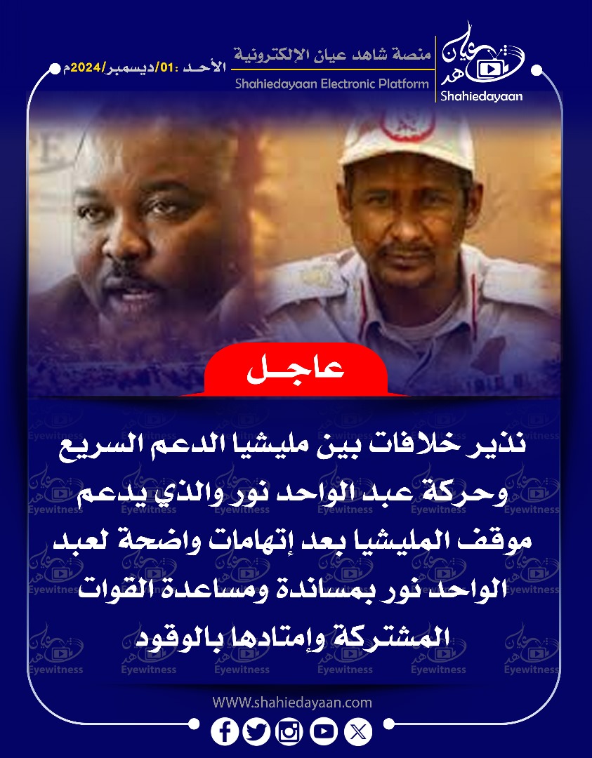 خبر في صورة عاجل : نذير خلافات بين مليشيا الدعم السريع وحركة عبد الواحد نور شاهد عيان ديسمبر 2, 2024 0 أقرأ المزيد ..
