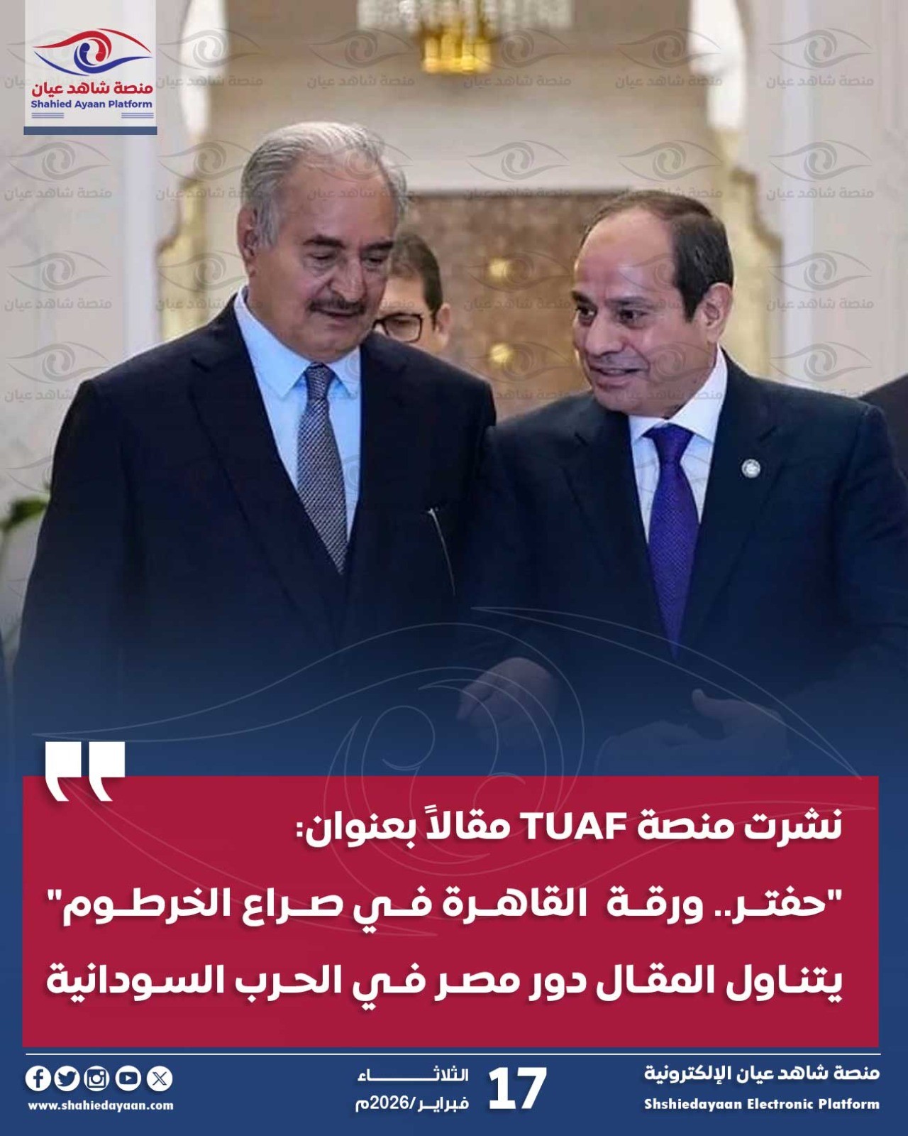 نشرت منصة TUAF مقالاً بعنوان: “حفتر.. ورقة القاهرة في صراع الخرطوم” يتناول المقال دور مصر في الحرب السودانية معتبراً أن…