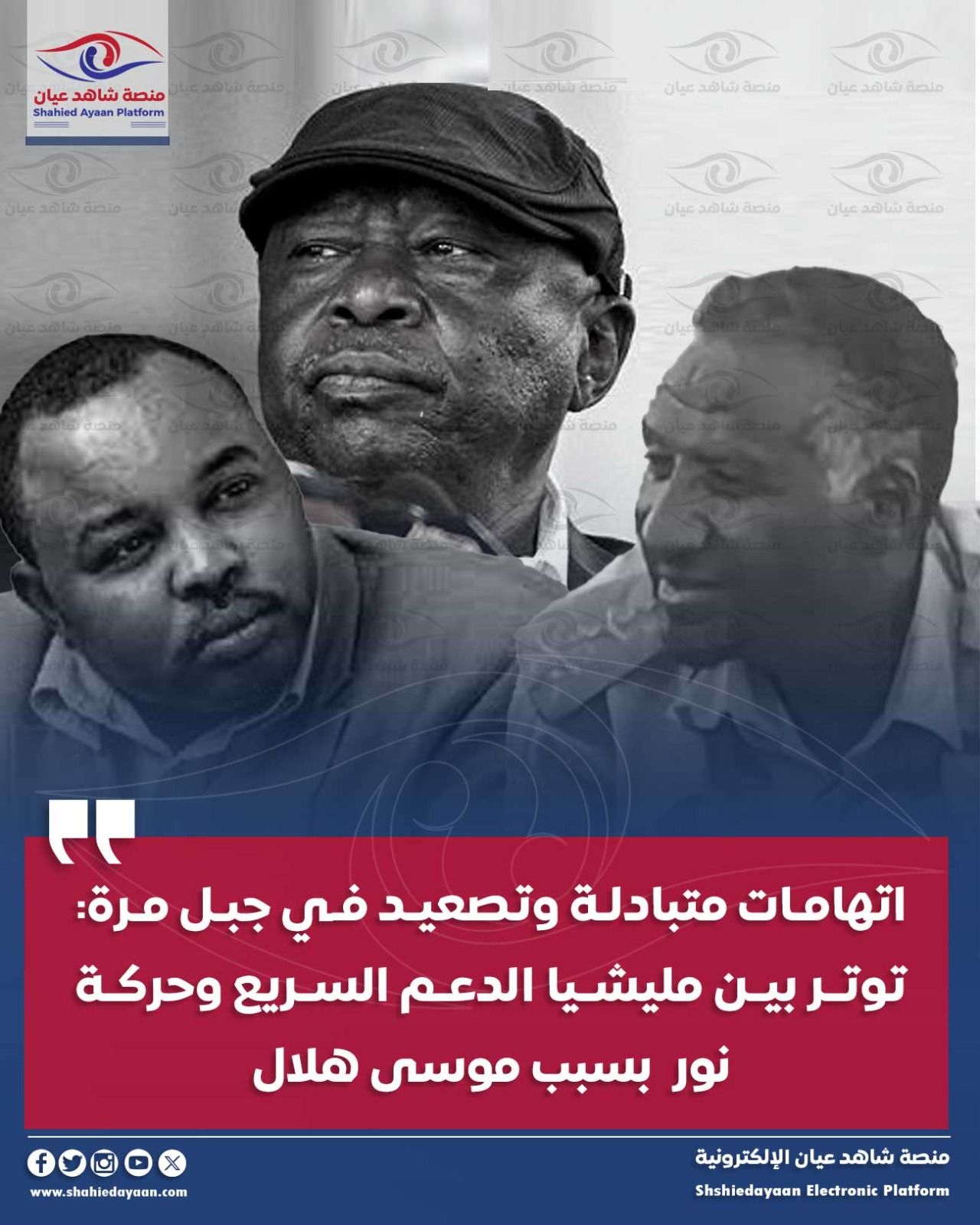الأخبار اتهامات متبادلة وتصعيد في جبل مرة: توتر بين مليشيا الدعم السريع وحركة نور بسبب موسى هلال شاهد عيان مارس 2, 2026 0 أفادت مصادر ميدانية ل” شاهد عيان ” في حركة/جيش تحرير السودان بقيادة عبدالواحد محمد نور بأن مليشيا قوات الدعم السريع… أقرأ المزيد ..