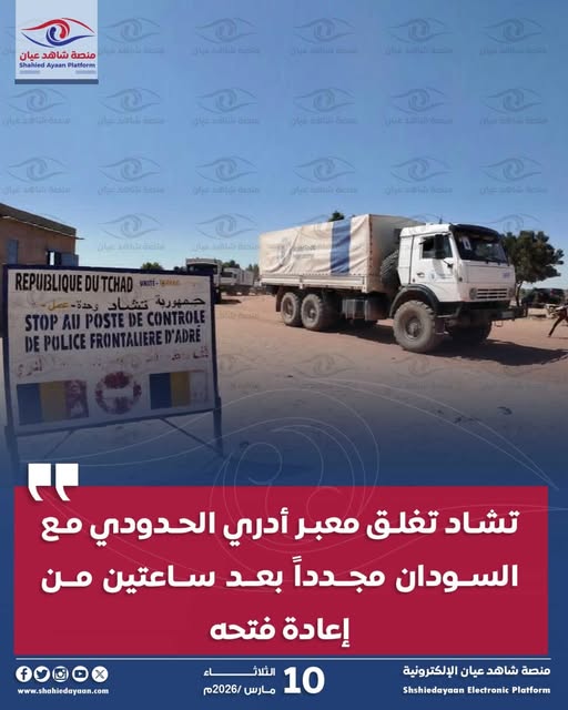 الأخبار تشاد تغلق معبر أدري الحدودي مع السودان مجدداً بعد ساعتين من إعادة فتحه شاهد عيان مارس 11, 2026