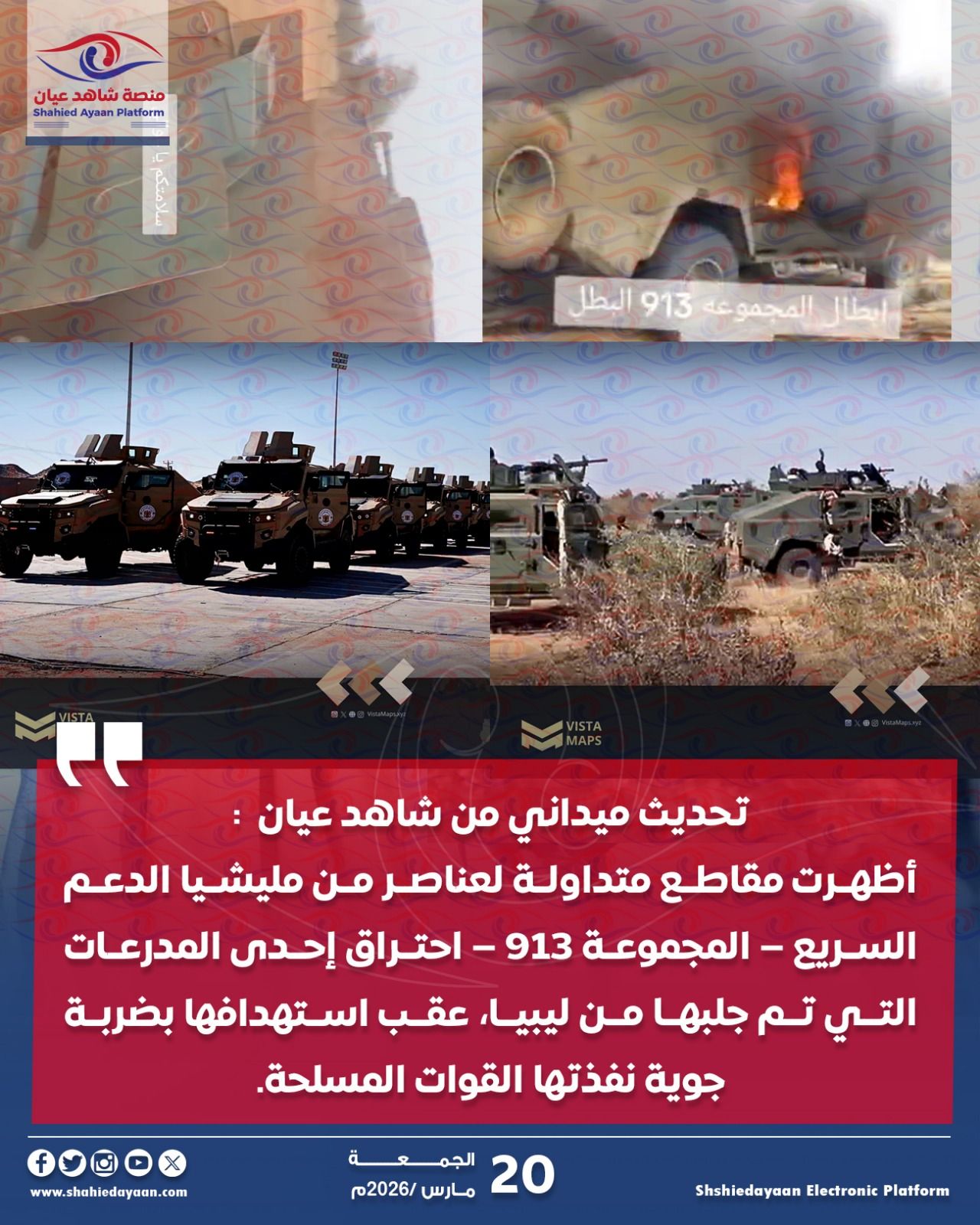 تحديث ميداني من شاهد عيان : أظهرت مقاطع متداولة لعناصر من مليشيا الدعم السريع – المجموعة 913 – احتراق إحدى…