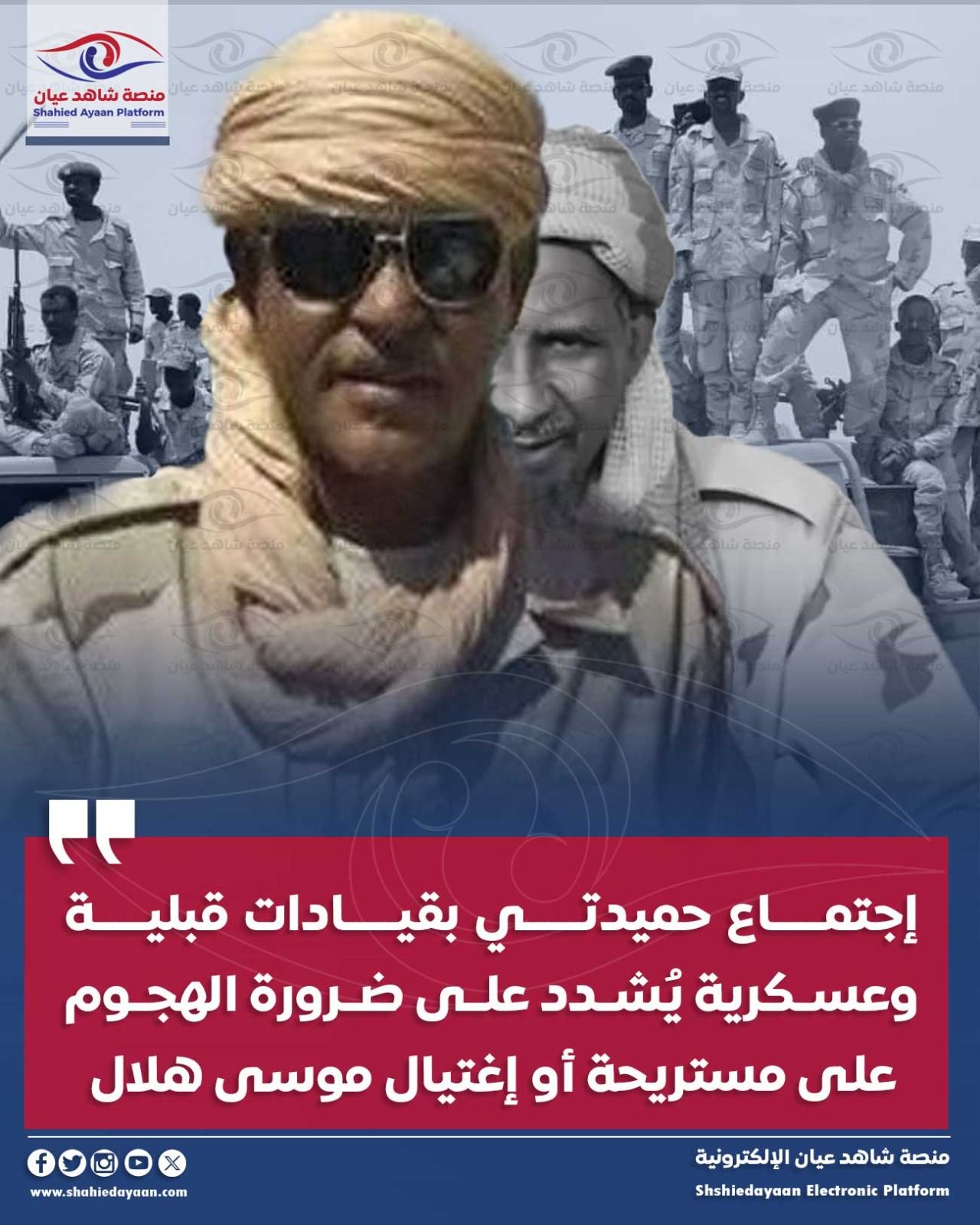• مصادر من كمبالا: إجتماع حميدتي بقيادات قبلية وعسكرية يُشدد على ضرورة الهجوم على مستريحة أو إغتيال موسى هلال