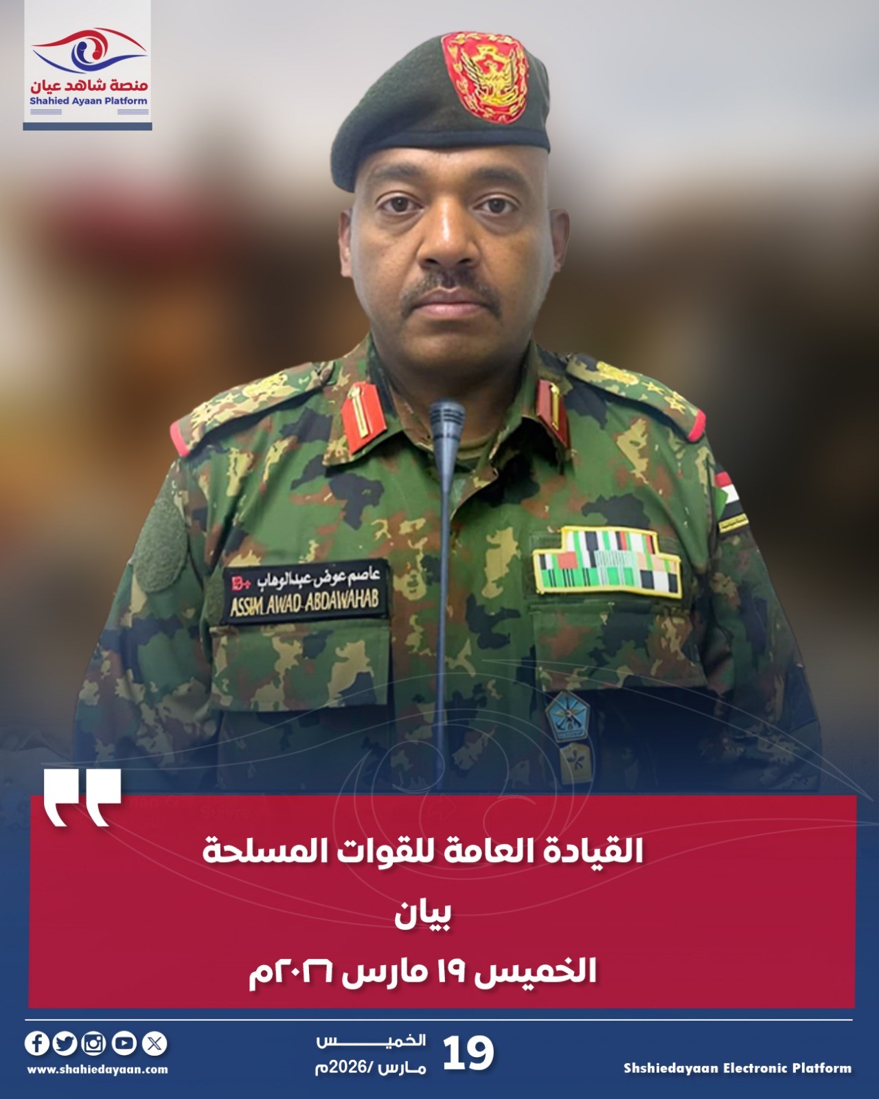 بسم الله الرحمن الرحيم القيادة العامة للقوات المسلحة بيان الخميس ١٩ مارس ٢٠٢٦م تابعت القوات المسلحة السودانية ما وقع من…