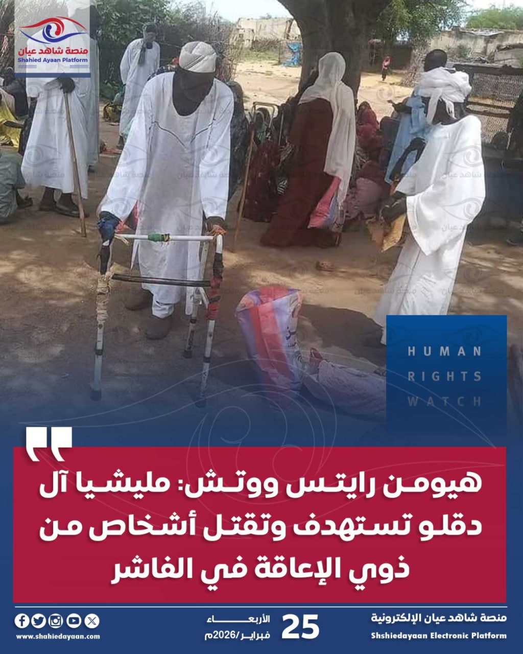 منظمة «هيومن رايتس ووتش» تتهم مليشيا الدعم السريع باستهداف وقتل أشخاص من ذوي الإعاقة وإساءة معاملتهم خلال اجتياح مدينة «الفاشر»…